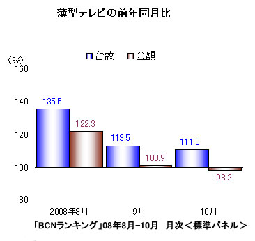 薄型テレビの販売金額前年同月比は、08年10月で98.2%と前年割れ。液晶が99.6%、プラズマが90.9%でともに前年を下回った。プラズマは、07年9月-08年10月の間は、ほぼ毎月前年割れで推移していたが、液晶も9-10月の2か月で大きく落ち込んでいる。