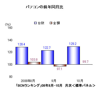 続いてPCは、ミニノートPC(液晶サイズ10.2インチ以下のノートPC)が需要をけん引し、8-10月の販売台数の前年同月比でそれぞれ120%を超えた。反面、PC全体の単価はこの1年で23%下落。金額では一転して前年を割った月が目立つ。