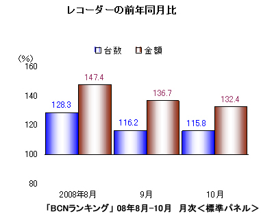 レコーダーの8-10月の前年同月比は、今年半ばの急成長に比べて台数は115%、金額は135%前後で伸びが止まってきたものの、年末商戦も2ケタ成長は維持できる見通し。10月のレコーダー全体に占めるBDレコーダーの比率は、台数で47.6%、金額で65.3%まで拡大している。平均単価は10万5000円と、1年で25%下落し、本格的な普及期に入ったとみられる。