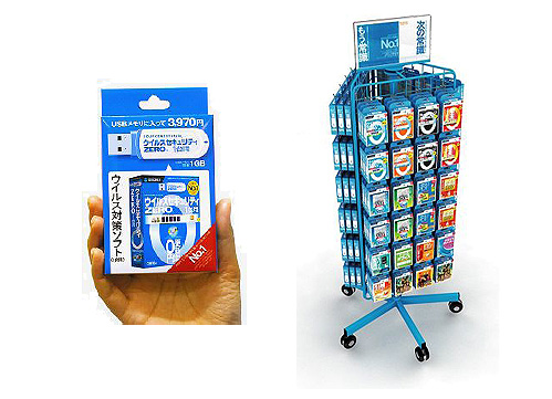 「Uメモ」は、CD/DVDドライブを持たないミニノートPCでも使用できるよう、ソフトをUSBメモリに収録した製品。今回、パッケージサイズを横14.7×高さ26.5cmから、横8.0×高さ11.3cmの手のりサイズに変更し、吊るして陳列できるようにした。