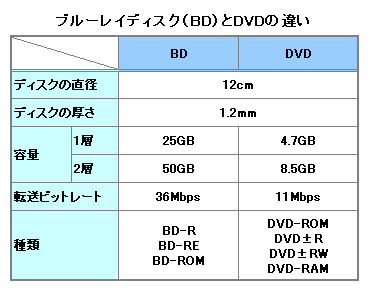例えば、1層のDVDの容量が4.7GBであるのに対し、1層のBDは25GBと約5倍の容量をもつ。また、1秒あたりに伝送できるデータ量を示す「転送ビットレート」もDVDより高い。DVDは11Mbpsだが、BDは36MbpsとDVDの約3倍。地上デジタル放送の転送ビットレートが約17Mbps、BSデジタル放送が最大約24Mbpsなので、それらを充分カバーしている。