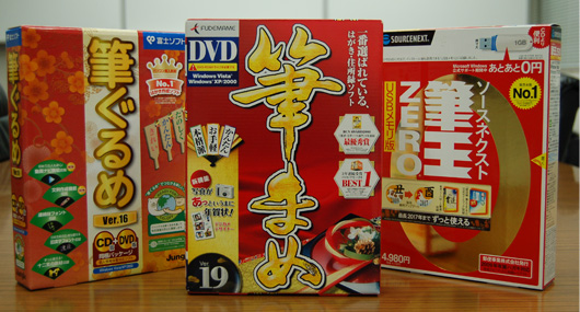 左からジャングルの「筆ぐるめ」、クレオの「筆まめ」、ソースネクストの「筆王」