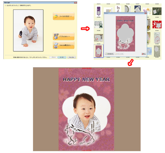 今回は3本のソフトで、家族写真などを使った写真入り年賀状を作成してみた。最近のはがき作成ソフトにはデジカメで撮った写真を貼り付けることができるデザインテンプレート(テンプレート)を収録しているものが多い。3タイトルとも写真入り年賀状をカンタンに作成できる「デジカメ年賀状」モードも搭載しており、使用する写真、気に入ったテンプレートを選択するだけでカンタンに写真入り年賀状を作成できた。
