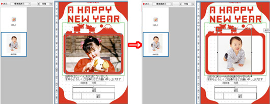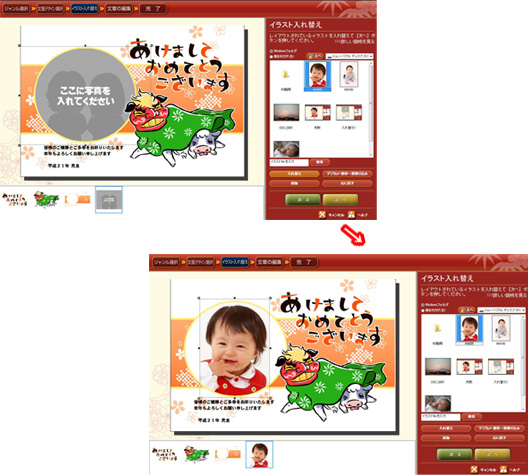 クレオの「筆まめ」は、写真、写真を貼りつけたい箇所を指定し、「入れ替え」ボタンを押すとテンプレートに写真が貼りつく。この「入れ替え」ボタンは他の操作ボタンと同じ色、サイズのため、見落としがちになる。ボタンを押さずに「筆ぐるめ」と同様、写真をダブルクリックしてしまうと、テンプレート全体の上に写真が乗っかる形で表示されてしまう。操作には慣れが必要なようだ。