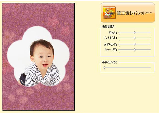 「筆王」は、写真の位置、サイズの調整のほか、「明るさ」「コントラスト」「あざやかさ」「シャープさ」の調整ができる。スライドバーを左右に動かして補正効果の強弱を設定する。一括補正機能などは搭載していないので、画像補正作業に慣れていないと少々戸惑うのではないだろうか。