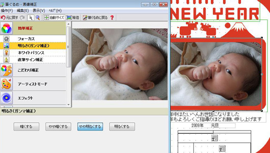 対して写真をキレイに見せたいのであれば、クレオの「筆まめ」、ジャングル「筆ぐるめ」の補正機能を活用しよう。特に「筆まめ」の「美肌補正」「美白・日焼け補正」はなかなか使い勝手が良かった。