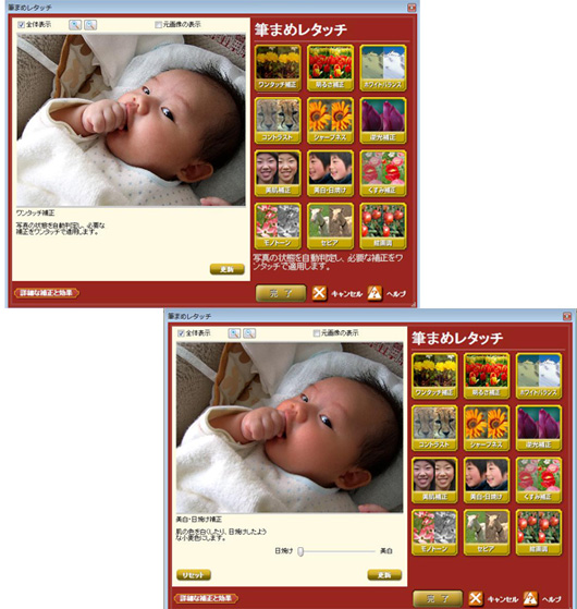 「筆まめレタッチ」画面。上は「ワンタッチ補正」を、