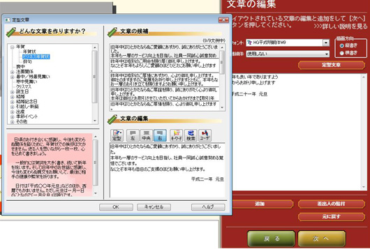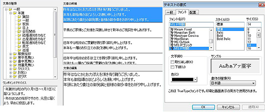「筆王」の例文選択画面とフォント設定画面