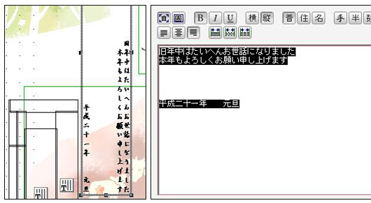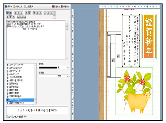 「筆ぐるめ」は、挨拶文付きテンプレートを多数収録している上、「例文」収録数も3タイトルの中で1番多かった。例文の数は、年賀状用の「友人」向けが64例、「ビジネス」向けが54例、「フォーマル」向けが102例だった。縦・横書きの設定、フォント種類・サイズの設定、中央・左右寄せが可能。しかし、日付けの行だけ右寄せ(下寄せ)に、といった1行だけの配置設定はできなかった。これはスペースキーを使って、配置場所を調節しなくてはいけないようだ。