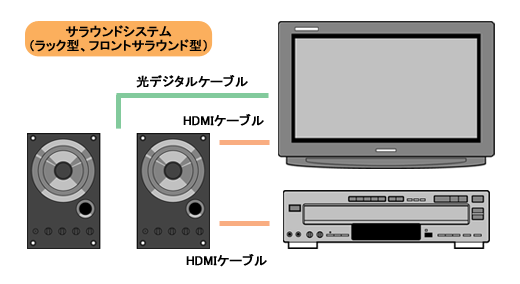 ラック型サラウンドシステムとテレビを接続するには、基本的にHDMI端子と光デジタル音声端子の2つを使用する。さらに、レコーダーとサラウンドシステムをHDMI端子で接続すれば、テレビとレコーダーは直接つながずに済む。