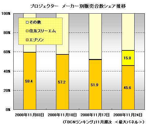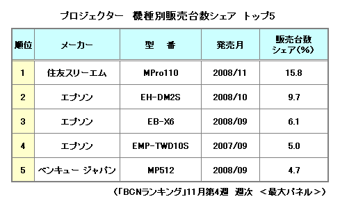 「MPro110」の1位獲得は、プロジェクター市場全体の構造にも変化をもたらしている。例えば、メーカーの販売台数シェアでは、これまで年間を通じてほぼ50-60%で推移していた1位のエプソンがシェアを下げ、11月第4週目には45.6%と5割を切った。一方、住友3Mは15.7%を占め、ベンキュー ジャパン、ソニーなどの主要メーカーを抑えて2位となった。