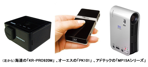 これまでプロジェクターには、「MPro110」のようなミニサイズのラインアップはほとんどなかった。しかし最近になって、住友3Mのほか海連、オーエス、アドテックなどが次々とミニプロジェクターの発売を発表。にわかに活気を帯びてきた。現在、ミニプロジェクターの価格帯は4万円から5万円台半ばとなっている。