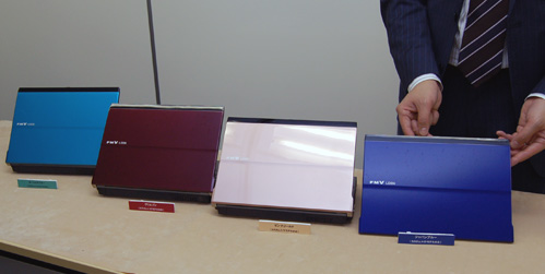 女性ユーザーを意識し、ピンクパープルとミルクホワイトの2機種を用意したコンパクトノートPC。成型時に金型の中に転写フィルムをはさみ込む「成型同時加飾転写工法」を採用し、どこから見ても美しいラウンドフォルムやグロッシーな質感を実現。本体カラーに合わせたレーザーマウスも同梱する。