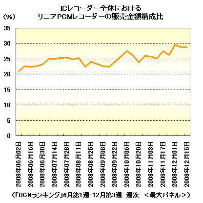 リニアPCMレコーダーの販売金額構成比が、ICレコーダー全体のおよそ3割を占めるようになった。「BCNランキング」の11月第1週(11月3-9日)以降20%台後半で推移し、12月第3週(12月15-22日)には28.7%まで拡大したもの。ICレコーダーの中でも、高音質で臨場感たっぷりに録音できるのがウケて人気を集めているリニアPCMレコーダー。特に、オリンパスと三洋電機が10月と11月に相次いで発売した新モデル2機種が好調で、金額構成比を押し上げた。