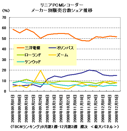 現在、リニアPCMレコーダーのトップメーカーは三洋。12月第3週では台数で51.8%、金額では40.5%を占めている。一方、2位はオリンパスだが、10月第1週(10月6-12日)以降、3位以下のメーカーを引き離して成長を続けている。12月第3週には台数で15%、金額では20.9%を占めるまでになった。