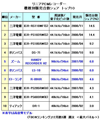 ちなみにトップ10の顔ぶれは、三洋が5機種、オリンパスが2機種、ズーム、ローランド、ティアックがそれぞれ1機種。また、録音する際の音質を規定するサンプリング周波数と量子化ビット数別に見ると、高音質な収録が可能な「96kHz/24bit」が3機種、「44.1kHz/16bit」などそれ以外が7機種ランクインした。(BCN・井上真希子)