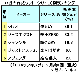 3位はジャングルの「筆ぐるめ」で、シェアは10.8%。操作手順をわかりやすく説明する「ナビ機能」や画像の編集などが手軽にできる「補助機能」を搭載し、初めて使う人でも簡単に年賀状を作成できるという。収録素材は、DVD版で、「レイアウト」が4000点、「イラスト・写真・素材」が2万2400点など。