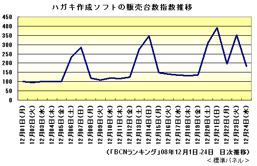今年も残りわずかとなった。年始の挨拶状、年賀状の準備は万全だろうか? ハガキ作成ソフト商戦は、クリスマス前の週末にピークだったようだ。そこで、「BCNランキング」データで、ハガキ作成ソフトの最新売れ筋ランキングを紹介しよう。