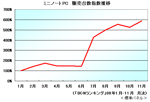 ミニノートPC市場の火付け役であるASUSTeK Computer(ASUS)の「Eee PC 4G-X」が今年の始めに発売。08年1月を基準にした販売台数の指数推移では、1月-6月の08年前半は約150%前後で推移していた。その後7月に427.4%と大きく販売台数を伸ばし、その後は右肩上がりで推移。08年11月には588.2%にまで成長した。(関連記事:「Eee PC」が大人気、発売から3日で1万台を完売、次の入荷は2月中旬か?)