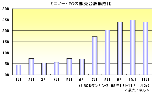 ノートPC市場全体の中でミニノートPCが占める割合も増えている。08年1月では4.4%しかなかったが、7月には17.3%、エイサーが市場参入した8月は2割を超えた。夏以降も25%前後のシェアをキープしており、ノートPC市場全体でも、ミニノートPCの影響力の大きさが伺える。