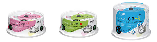 ラインアップと実勢価格は、録画用DVD-Rの30枚パック「DR120DMC30PN+T」が2180円前後、データ用DVD-Rの30枚パック「DR47MC30PN+T」が1880円前後、データ用CD-Rの50枚パック「CD-R80CMX50PN+T」が1680円前後の見込み。
