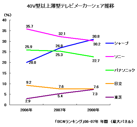 2008年の40V型以上の薄型テレビ販売台数シェアで、シャープが首位の座を獲得した。シャープが40V型以上の薄型テレビ市場で年間シェアNo.1になったのは初めて。大画面薄型テレビ市場は、06年以降ソニーがトップを維持してきたが、08年はシャープが躍進、30.8%にシェアを伸ばし、30.2%のソニーを僅差でかわした。