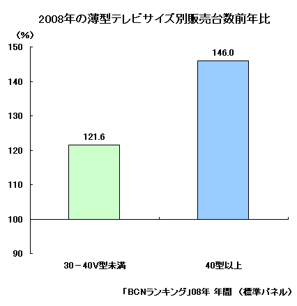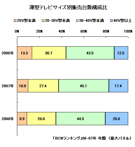 08年1年間の薄型テレビ市場全体に占める販売台数構成比は、30-40V型未満が44.5%で、市場全体の約半数を占めている。しかし、その構成比は、前年比0.6ポイント減でほぼ横ばい。一方、40V型以上は08年に20.6%を占め、前年に比べ3.2ポイント拡大している。
