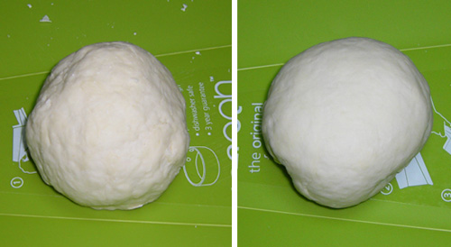 塊になったばかりの生地(左)としっかり捏ねた生地(右)