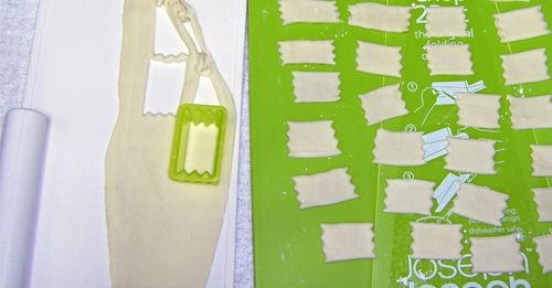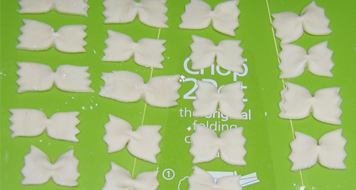 型を抜いたら箸などで中心部分をキュッと絞るとチョウのような形になる。これでファルファッレは完成。あとはトレイなどに並べておこう。