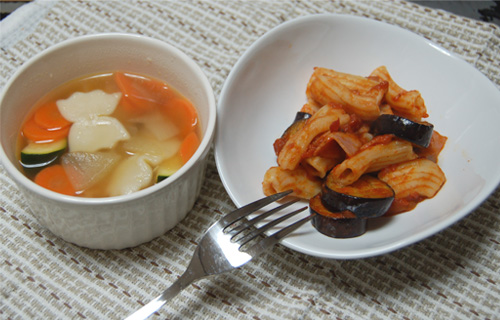 ファルファッレの彩りスープと、リガトーニのアラビアータ