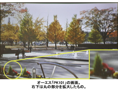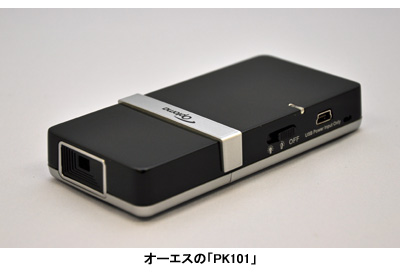 高級感あるブラックのボディが目を引くのは、オーエスの「PK101」。09年1月に米・ラスベガスで開催された家電見本市「2009 International CES」において、優れたデザインと技術をもつ製品を表彰する「2009 Innovations Awards」のVideo Displays部門で賞を獲得。デザイン性の高さにはうなずける。サイズは携帯電話よりも少し大きいくらい。