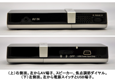 右側面にはAV端子と焦点調節ダイヤル、スピーカー、左側面には電源スイッチとUSB端子、底面にはバッテリーと三脚穴に加え、滑り止めにゴム製の足を3つ備える。放熱のための格子はなく、すっきりして見える。