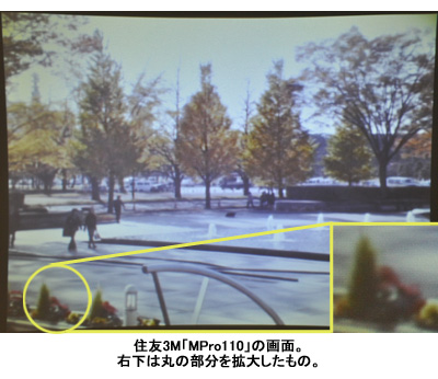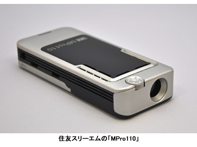 住友3Mの「MPro110」はシルバーとブラックのツートンカラー。宇宙船を想起させるようなメカニックな外観は、他のモデルと比べるともっともプロジェクターらしいデザインといえる。サイズは携帯電話をひとまわり大きくした程度だ。