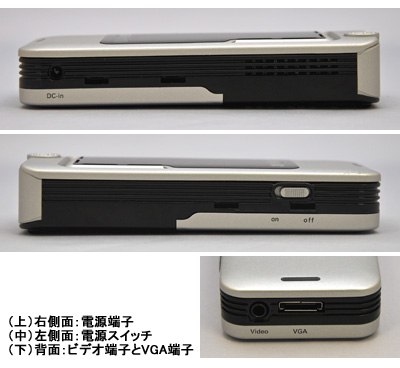上面の前方に焦点調節ダイヤル、右側面に電源端子、左側面に電源スイッチ、背面にはビデオ端子とVGA端子を装備。底面にはバッテリーと三脚穴を備えるほか、レンズのある前面がやや高くなるよう足が2つ付いている。内部の放熱については、上面と底面、側面に格子を設けてある。なお、スピーカーは非搭載のため、動画は見られるものの音声は出力できない。