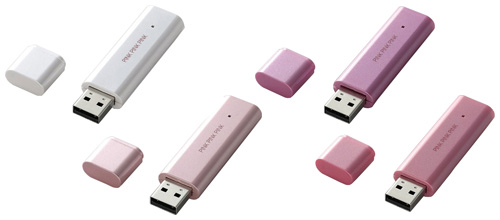 丸みのあるデザインを採用し、コスモスパール、ペールローズパール、フクシアパール、ピーチパールの4色をラインアップする女性向けのUSBメモリ。