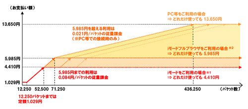 改訂後は、パケット通信料金を5985円まで利用する場合が、1パケット当たり0.084円、5985円を超える場合は1パケット当たり0.021円。なお、国際ローミング中のパケット通信はiモード通信含め定額の対象外となる。