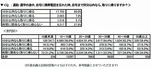 質問項目は「通勤や通学の途中、自宅に携帯電話を忘れた時、自宅まで何分以内ならば、取りに帰りますか?」というもの。