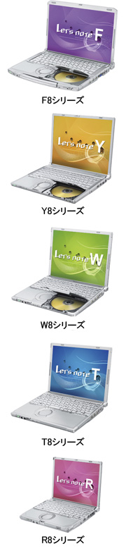 ラインアップは14.1型液晶と250GBのHDDを搭載した「F8シリーズ」「Y8シリーズ」、12.1型液晶と160GBのHDDを搭載した「W8シリーズ」「T8シリーズ」、10.4型液晶と160GBのHDDを搭載した「R8シリーズ」の5シリーズ。