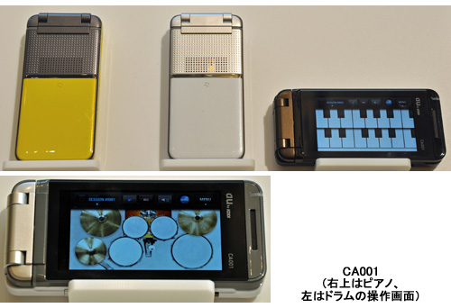 「CA001」は、auとして初めて3.1インチのタッチパネルを搭載。ヤマハの楽器エンジン「Mofiano」を採用し、ピアノやドラム、マラカスなどの楽器を画面をタッチしたり本体を振ったりして演奏することができる。楽器は世界のさまざまな国や地域から11種類を収めた。好きな楽器を組み合わせて作曲し、着信音にすることも可能。
