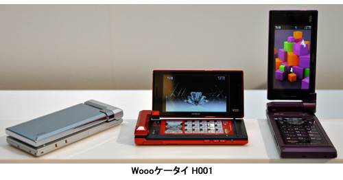 映像を見たり撮影したりする機能を充実したモデルもある。「Woooケータイ H001」は、480×854ドットの液晶画面として、世界で初めて3D表示に対応。着信時やテレビ電話などの一部の利用シーンを除き、ほとんどの表示で3D化が可能。左下の専用ボタンで表示を切り替えると、写真やアニメーションが立体的に浮き上がって見える。