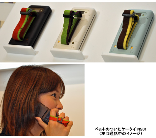 「ベルトのついたケータイ NS01」は、背面にベルトを取り付けた斬新なデザイン。ベルトに手を通すことで、通話や持ち運びの際に手が本体にフィットしやすい。ベルトは取り外しが可能で、別売りのベルトでカスタマイズすることも可能。