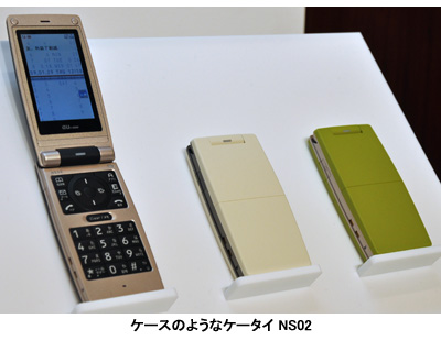 「ケースのようなケータイ NS02」はアタッシュケースがモチーフで、側面がカバンの開閉部とそっくり。本体の中央部にふくらみをもたせて手にフィットしやすくした。画面上の文字サイズは6段階に調節できる。ディスプレイは2.7インチ。サイズは約51×102×19.4mm、重さは約134g。カラーはブラック、アイボリー、グリーン。