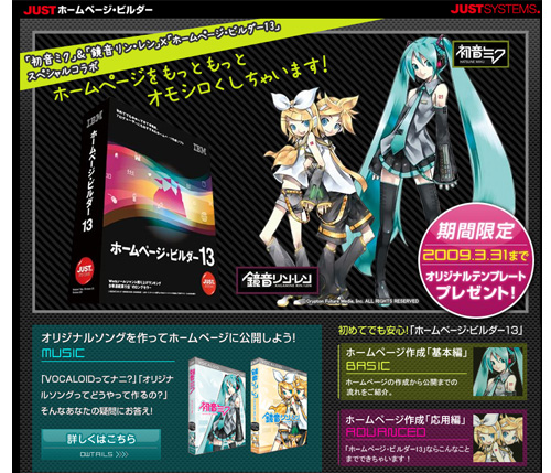 具体的には、「初音ミク」「鏡音リン・レン」が「IBMホームページ・ビルダー13」を紹介するコンテンツや、「初音ミク」「鏡音リン・レン」で音楽を作ってホームページで公開する方法を解説するページを公開し、相互の活用提案を行う。このほか、「IBM ホームページ・ビルダー13」購入者を対象に、「初音ミク」「鏡音リン・レン」のキャラクターをあしらったホームページ・ビルダー用オリジナルWebテンプレートを3月31日まで提供する。