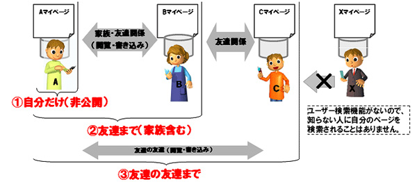 作成したプロフィールや日記は、「自分だけ」「友達まで」「友達の友達まで」の3段階で公開範囲が選択できる。「友達」は、iモードのメールアドレスを持っているユーザーのみ招待可能。また、ユーザー検索機能はなく、公開範囲を「友達まで」の設定にすれば、それ以外の人から自分のページを閲覧することはできない。