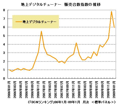 地上デジタルチューナーの売れ行きが好調だ。「BCNランキング」によると、06年1月を1とした販売台数指数で09年1月は5.9と3年間でおよそ6倍という大幅な成長を見せている。大手家電量販店の売り場状況を含め、地上デジタルチューナーの販売動向を探った。