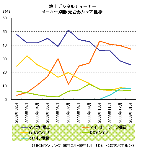 地デジチューナーのメーカーシェアを見てみると、それまで2位だったアイ・オー・データ機器(I・Oデータ機器)が08年8月以降、販売台数シェアを伸ばし続け、10月に43%を獲得し首位に立った。その後、40%前後で推移している。I・Oデータ機器が1位になった要因は、5月発売の地デジのみに対応する「HVT-T100」が人気を集めたため。8月の平均価格は1万3000円程度で、同月のチューナー全体の平均価格1万9000円を下回る低価格だ。