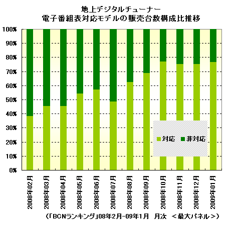 最後に、地上デジタル放送の特徴の一つ「電子番組表(EPG)」の対応状況もチェックしておこう。地デジは、このほか字幕表示、データ放送、双方向サービスなどの便利なサービスも備えており、対応製品を選べば、地デジチューナーでもこうした機能を利用できる。ただ、電子番組表に対応する割合は、09年1月で地デジチューナーの76.5%。1年前の08年2月の38.4%に比べると、対応モデルは増えてきているが、対応していないものもあるので注意しよう。