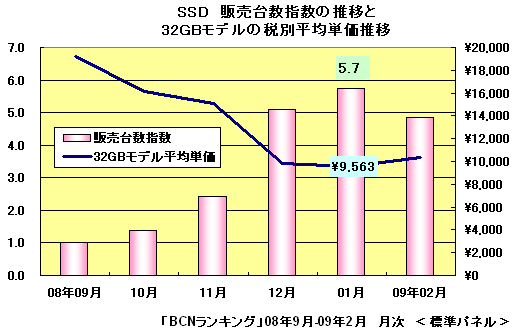 しかし、最近ではSSDの価格も下がってきている。売れ筋の32GBモデルの税別平均単価推移を見ると、08年9月は1万9211円と、2万円近かったが、11月には1万5094円となり、12月、09年1月には1万円を切った。2月は1万372円で、12-1月の3か月は1万円前後で横ばいに推移している。