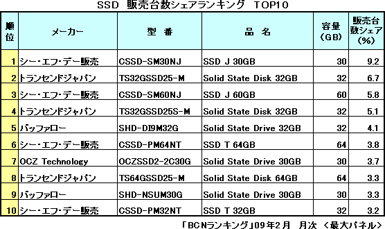 それでは今一番売れているSSDはどれか? 09年2月の月次販売台数ランキングを見ていこう。1位はシー・エフ・デー販売の30GBモデル「CSSD-SM30NJ」で、販売台数シェアは9.2%。2位はトランセンドジャパンの32GBモデル「TS32GSSD25-M」で、シェアは6.7%、3位はシー・エフ・デー販売の60GBモデル「CSSD-SM60NJ」で、シェアは5.8%だった。