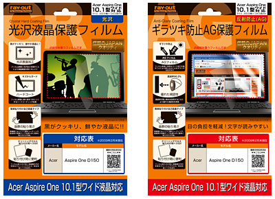 液晶面を保護する光沢タイプ「RT-AFCR1/101」と、太陽光や蛍光灯の液晶画面への映り込みを軽減する「RT-AFAG1/101」の2種類の液晶保護フィルムで、10.1ワイド型「Acer Aspier One D150」に適したサイズ。